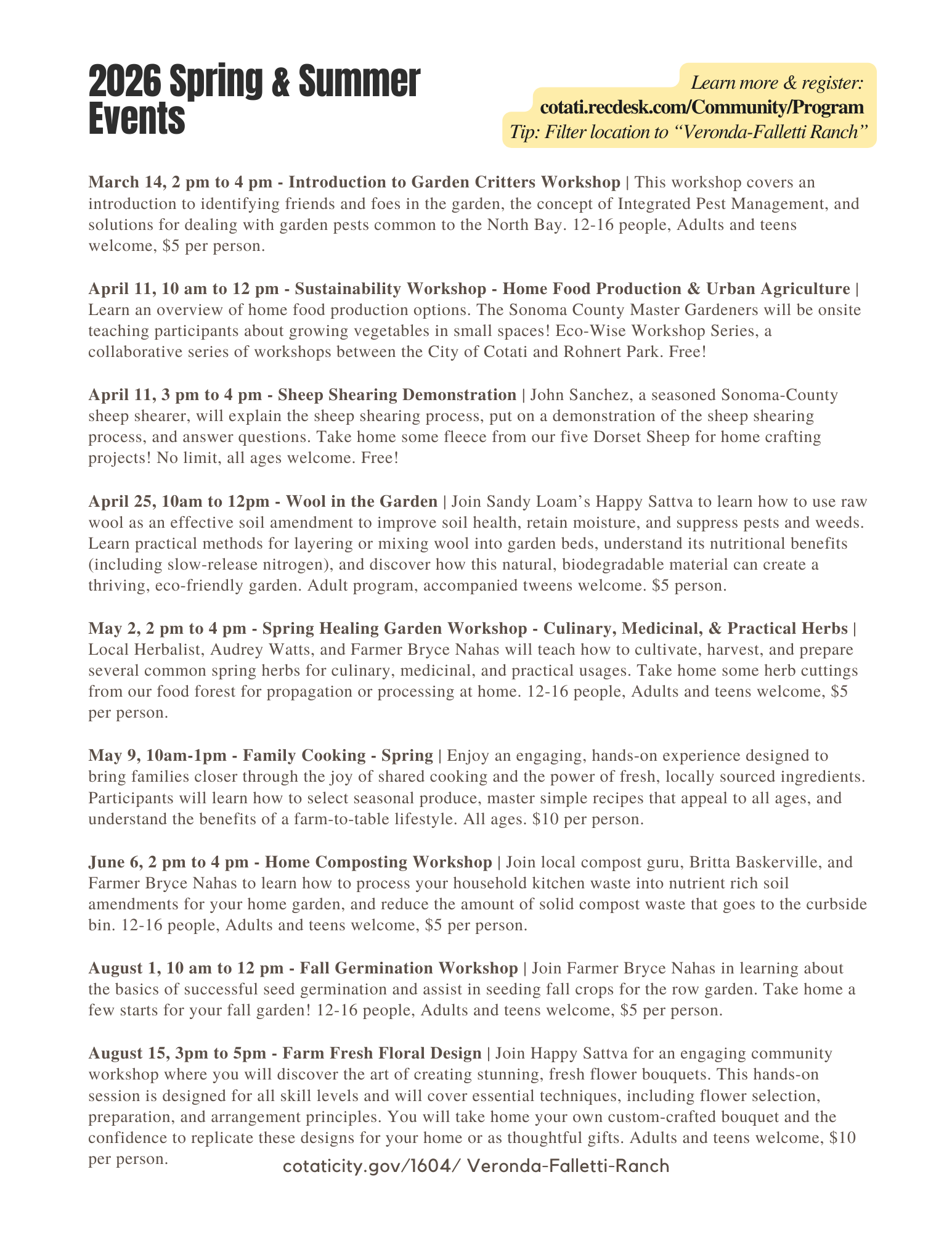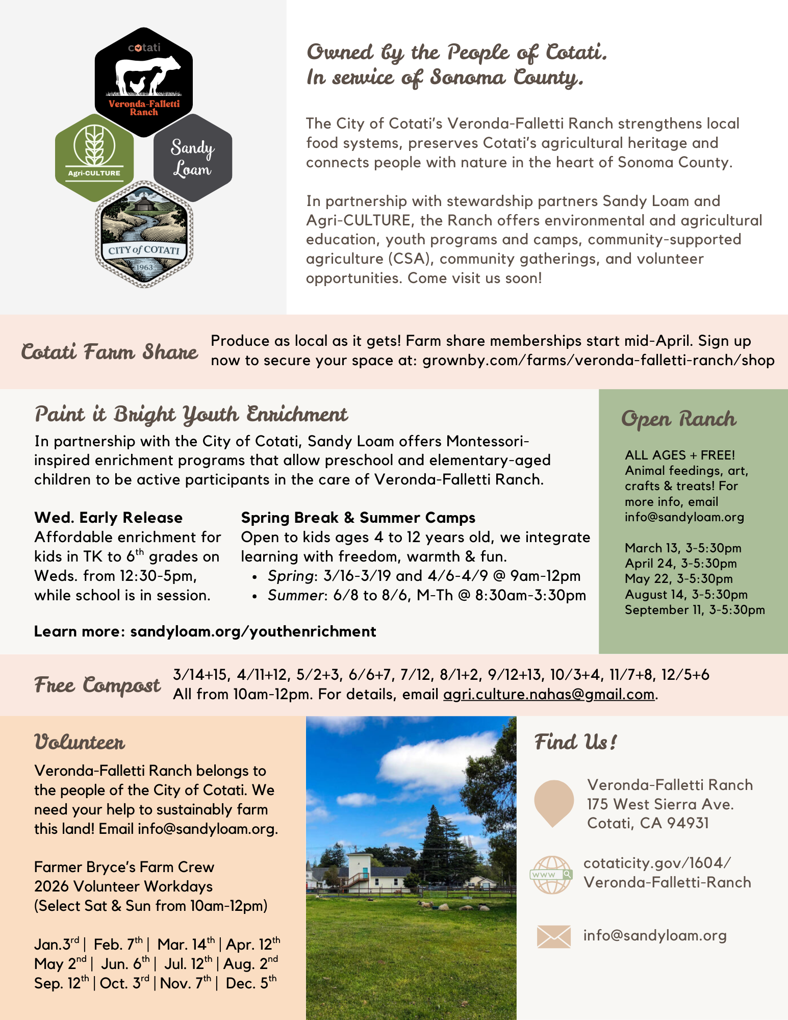 We are honored to report that Sandy Loam’s Work Plan at Veronda-Falletti Ranch was approved unanimously by City Council. In 2026, our work will center on three priority areas: Education & Engagement, Wellbeing and Community & Recreation. These focus areas are drawn from current community needs in Sonoma County, reflecting growing demand for accessible programs that foster wellbeing, hands-on learning opportunities, and inclusive spaces that foster connection, resilience, and belonging. We look forward to making Cotati and Sonoma County proud!